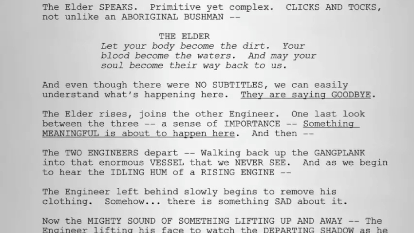 However there was a longer Scene, as the Actor who played the Sacrificial Engineer Daniel Twiss did in a interview as Prometheus was being released... he did mention that he had to Learn a bit of Alien Dialog to speak to a Elder.