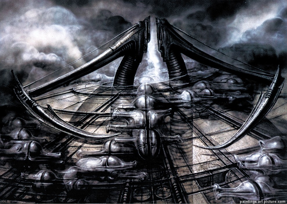 I have also imagined something else about it that I didn't mention,that the machine also produces other than xeno eggs but also ships (Giger did said many years ago that he imagined the derelict being grown like flower rather than built) and bald humanoid beings that are servants (or slaves),growing them in millions of Giger like tubs that have tubes connected to their stomach,some of Giger's old paintings did include bald humanoids.