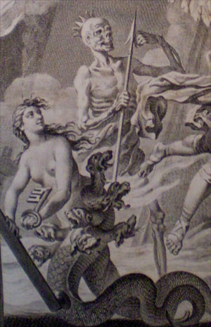 Sin is Part Female/Serpent and is very much described the same as Echidna who is the Greek Mother of Monsters and she is mother to Many Monsters.... included Hell Hounds like the sometimes Serpentine Hound Cerberus who guards the Gates of Hades (Hell) Cerberus is a 3 headed Hound sometimes with Serpent features or followed by Serpents. Echidna is also mother of the Gorgons and also the very Eagle that was sent to Punish Prometheus..