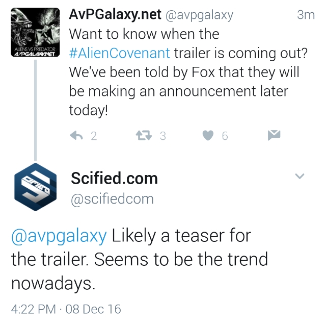 AdminEngineerDecember 08, 201646225 Views27 Replies![[UPDATE] Alien: Covenant trailer announcement coming tonight from Fox!](https://scified.com/topics/117947103071358.jpg)
