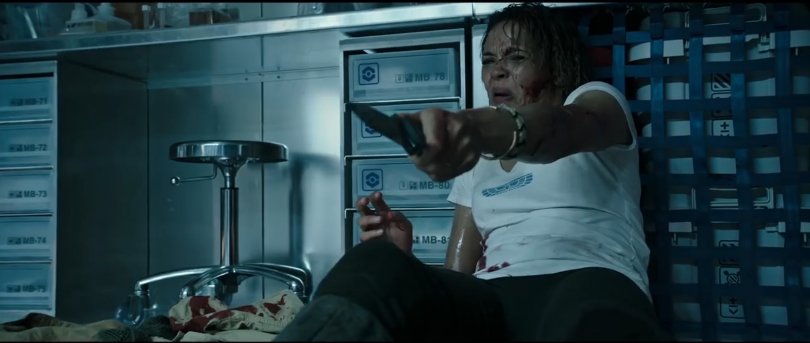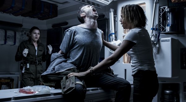 *Next shot Tess Haubrich makes a appearance she is in some pain.. or stress (only wearing a Tanktop). On board the Covenant? Hard to say.. has her scream leads to the next shot... (but why would she go down to the surface with no coat etc).
