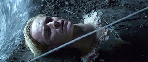 In the ampule/ritual room there is a huge statue of a (human?) head. There also seems to be a figure on the mural lacking a head (hard to tell). Also, the engineer fleeing something and coming too late to the door, loses his head. Finally, David’s head is ripped off by the engineer.