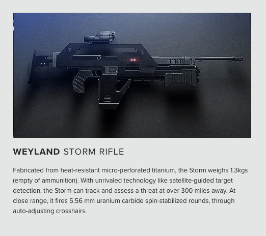 Weyland Industries introduces first rifle able to track targets from over 500 klicks away, as well as determine target’s health, physique and whether they can be locked down.