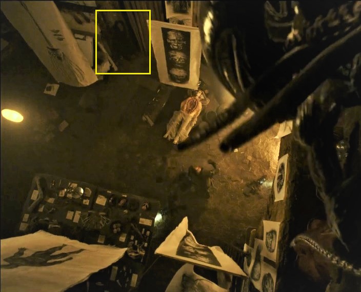 It looks like they're looking up at the Alien on the wall, could be David?