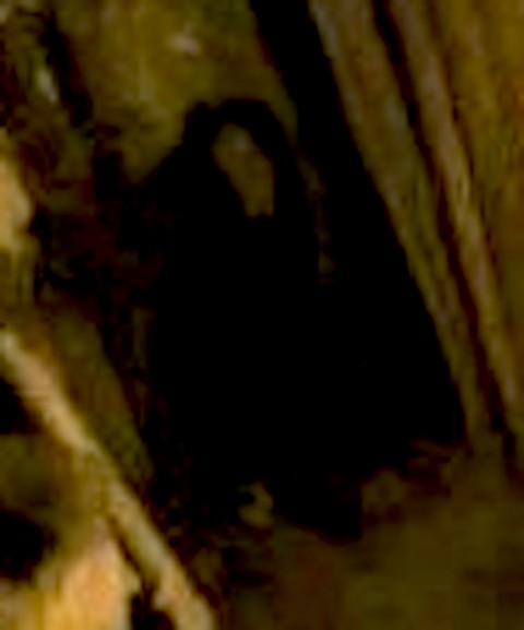 I am seeing something which could possibly be a cloaked figure, either kneeling or crouching in the corner of the lab/museum.
