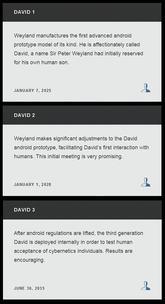 When David 2 is created Weyland is 38 years old and this is the first sets of Human Interaction between Weylands Creation and Humans