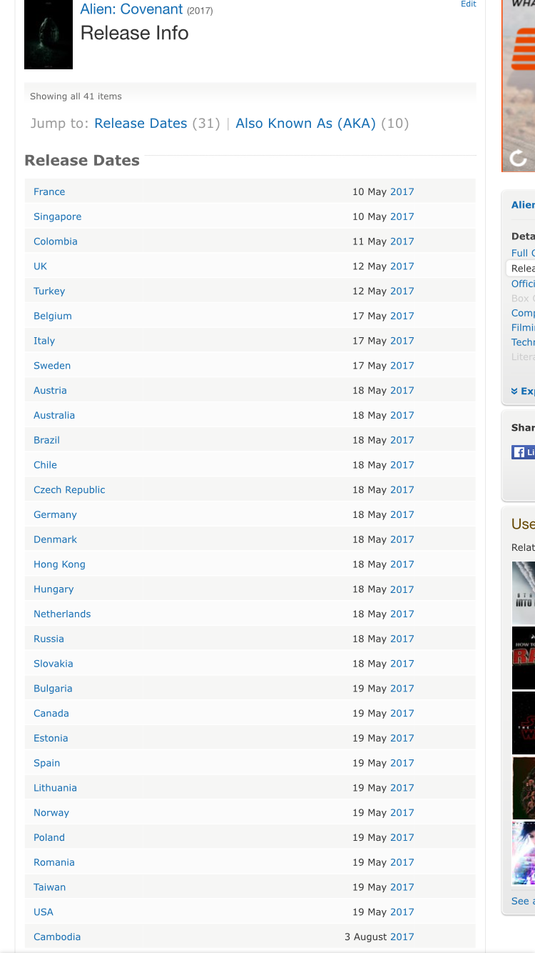MemberFacehuggerMarch 13, 20173342 Views8 RepliesAccording to MDB, the U.K. Release date for Alien Covernant has been moved forward by one week to the 12th May, is this a fact?